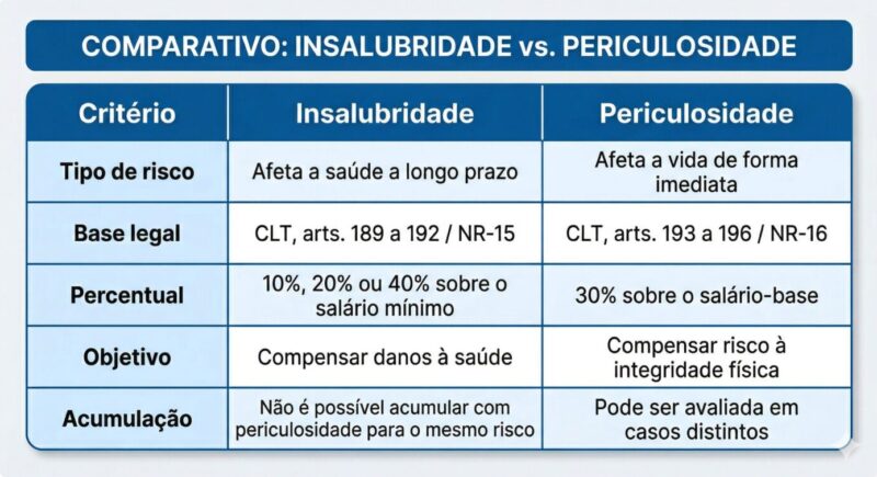 Embora ambos os adicionais tenham o objetivo de compensar condições de trabalho adversas, há diferenças importantes entre insalubridade e periculosidade: